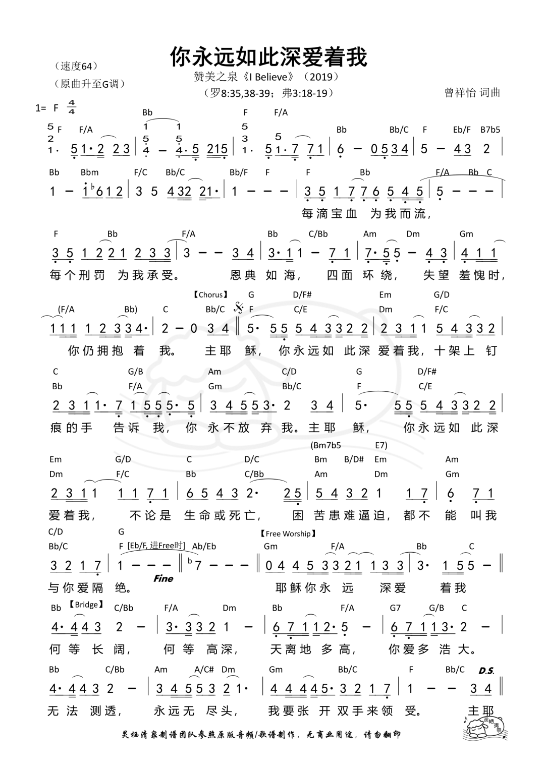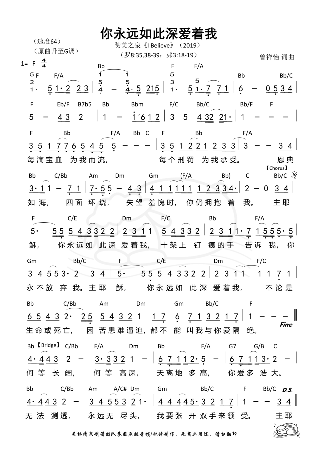 +- 首页 赞美之泉 正文 音频播放地址: 视频播放地址: 【Verse】 每滴宝血为我而流 每个刑罚为我承受 恩典如海 四面环绕 失望羞愧时 你仍拥抱着我 【Chorus】 主耶稣 你永远如此深爱着我 十架上钉痕的手告诉我 你永不放弃我 主耶稣 你永远如此深爱着我 不论是生命或死亡 困苦患难逼迫 都不能叫我与你爱隔绝 【Bridge】 何等长阔 何等高深 天离地多高 你爱多浩大 无法测透 永远无尽头 我要张开双手来领受 歌谱(原版): 歌谱(简版): 儿童敬拜1儿童敬拜2儿童敬拜3儿童敬拜4儿童敬拜5儿童敬拜6儿童敬拜7赞美之泉 赞美之门 收藏 分享 链接