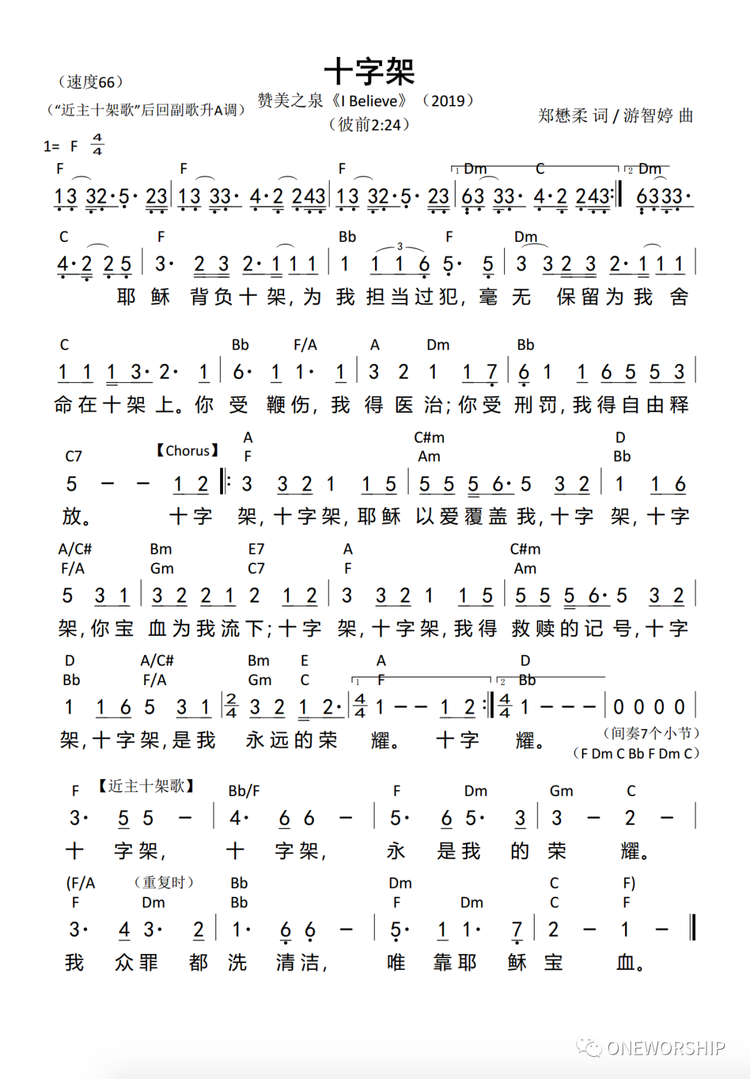 十字架 The Cross 词:郑懋柔 Tiffany M. Cheng 曲:游智婷 Sandy Yu © 2019 Stream of Praise Music / BMI. CCLI: 7129033 赞美之泉版权所有 [Verse] 耶稣背负十架 为我担当过犯 毫无保留为我捨命在十架上 你受鞭伤 我得医治 你受刑罚 我得自由释放 [Chorus] 十字架 十字架 耶稣以爱覆盖我 十字架 十字架 你宝血为我流下 十字架 十字架 我得救赎的记号 十字架 十字架 是我永远的荣耀 [十架为我荣耀] 十字架 十字架 永是我的荣耀 我众罪都洗清洁 唯靠耶稣宝血