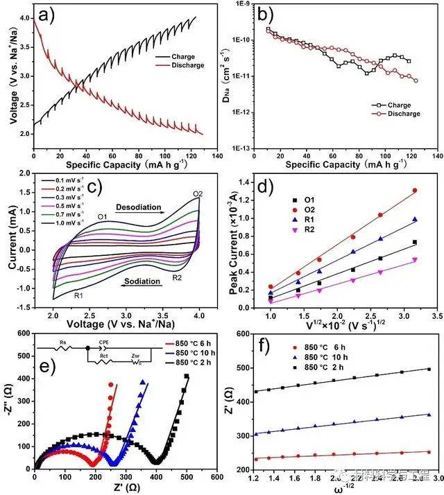 图4:P2-Na0.76Cu0.22Fe0.38Mn0.40O2钠离子电池正极材料的电极过程动力学:a)15 mA g-1下的充放电GITT曲线;b)对应的扩散系数(DNa);c)不同扫速下的CV曲线;d)ip(峰值电流)与v1/2(扫速的平方根)的拟合直线;e)不同煅烧时间样品的阻抗拟合曲线(插图为等效电路);f)Z¢(低频区阻抗)与ω-1/2(角频率平方根的倒数)的拟合直线。