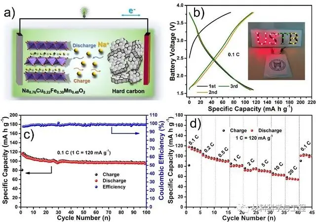 图6:以P2-Na0.76Cu0.22Fe0.38Mn0.40O2纳米项链为正极,硬碳为负极组装的钠离子全电池性能:a)全电池构造示意图;b)充放电曲线及点亮彩色LED灯的照片;c)循环性能;d)倍率性能。