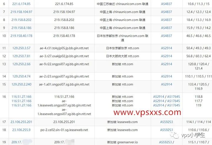 可以看到GreenCloudVPS新加坡vps电信去程绕美国洛杉矶,回程绕美国圣何塞,租用的leaseweb新加坡机房;联通去程回程都绕日本走NTT线路,不过联通延迟比较低,去程才110MS的延迟;移动去程回程也是走NTT线路,也是直连,延迟也比较低。三网综合来看,联通电信路由都比较不错,电信线路绕的有点远。