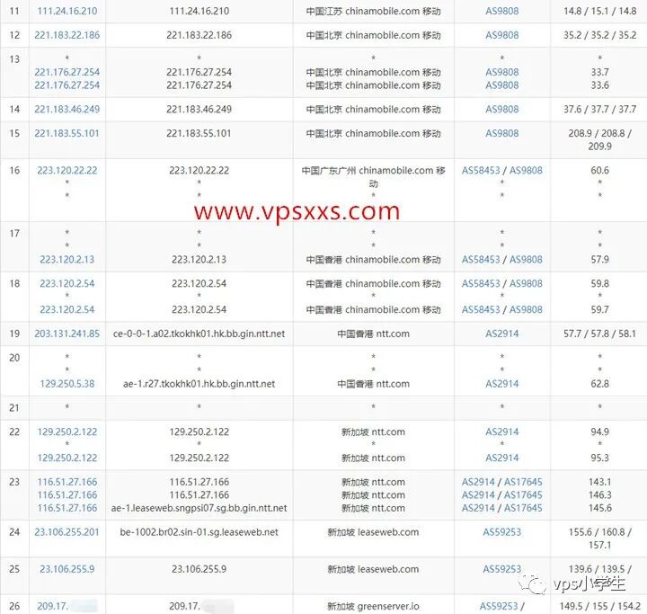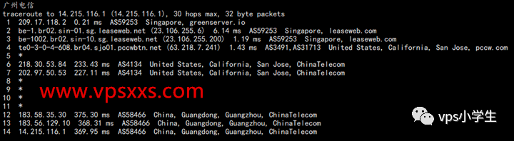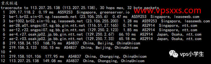 GreenCloudVPS新加坡vps到国内的延迟延迟都超过300MS了,肯定是绕路了,不过也正常,现在新加坡机房到国内都绕路。来看看GreenCloudVPS新加坡vps具体的三网路由: