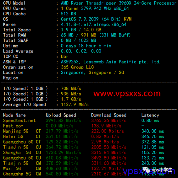 首先看一下GreenCloudVPS新加坡vps的硬件配置,可以看到是用的AMD Ryzen ThreadRipper 3960X处理器,这处理器性能比牙膏厂的要强几倍了,可以看到CPU是单核3.80GHz的频率。内存读出来991M,默认还有1G的虚拟内存。硬盘读出来14GB,硬盘平均读写速度1.1GB/s,这硬盘读写速度肯定NVMe硬盘无疑,硬盘读写速度太好了。