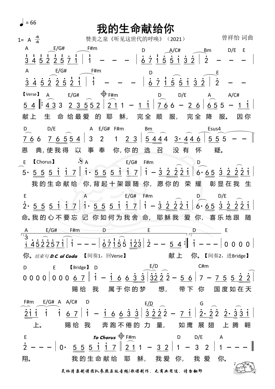 我的生命献给祢 I Will Offer You My Life 词、曲:曾祥怡 Grace Tseng © 2021 Stream of Praise Music / BMI. CCLI: 7176789 [Verse] 献上生命 给最爱的耶稣 完全顺服 完全降服 因祢恩典 使我得以事奉祢 祢的选召没有怀疑 [Chorus] 我的生命献给祢 背起十架跟随祢 愿祢的荣耀 彰显在我生命 我的心不要忘记 祢如何为我捨命 耶稣我爱祢 喜乐地跟随祢 [Bridge] 赐给我属于祢的梦想 带下祢国度如在天上 赐给我奔跑不倦的力量 如鹰展翅上腾翱翔