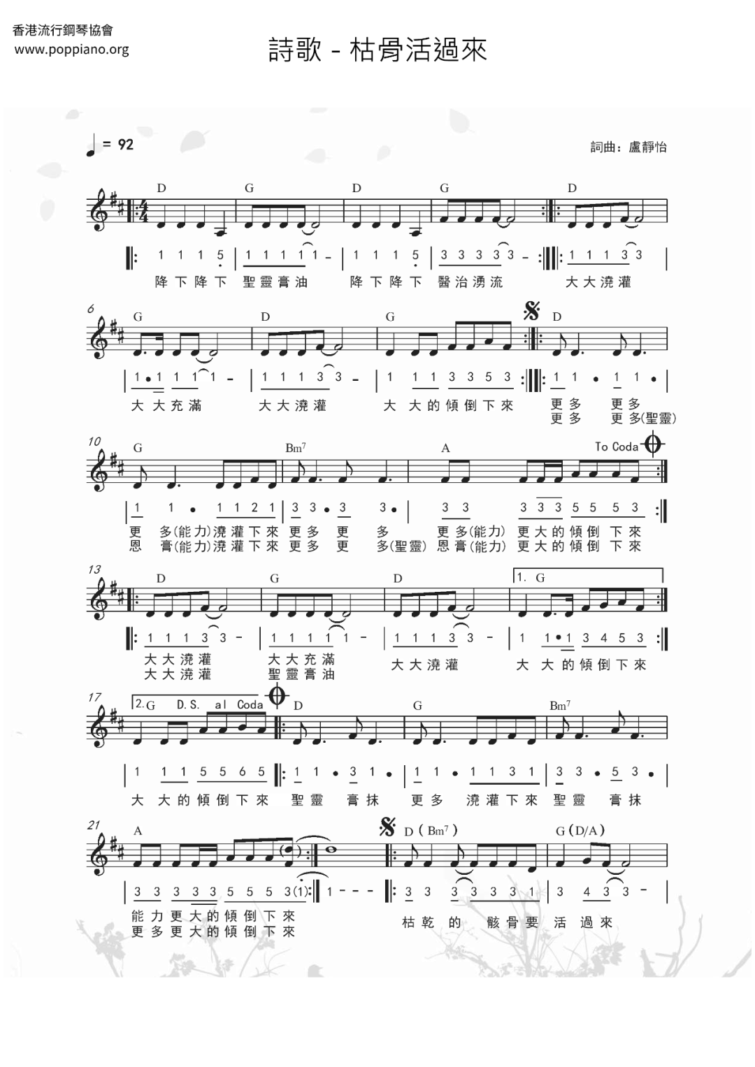 枯骨活过来 词曲:卢静怡 降下 降下 圣灵膏油 降下 降下 医治涌流 降下 降下 圣灵膏油 降下 降下 医治涌流 大大浇灌 大大充满 大大浇灌 大大的倾倒下来 大大浇灌 大大充满 大大浇灌 大大的倾倒下来 *更多 更多 更多(能力)浇灌下来 更多 更多 更多(能力) 更大的倾倒下来 更多 更多(圣灵) 恩膏(能力)浇灌下来 更多 更多(圣灵) 恩膏(能力)更大的倾倒下来 圣灵 膏抹 更多 浇灌下来 圣灵 膏抹 更多 更大的倾倒下来 (圣灵 膏抹 更多 浇灌下来 圣灵 膏抹 能力更大的倾倒下来) 大大浇灌 圣灵膏油 大大浇灌 大大的倾倒下来 大大浇灌 圣灵膏油 大大浇灌 大大的倾倒下来 (以西结书 37:1-6) 枯乾的骸骨要活过来 并且要用脚站起来 枯乾的骸骨要活过来 并且要用脚站起来 活过来 你们要活过来 站起来 你们要用脚站起来 活过来 你们要活过来 站起来 你们要用脚站起来 *活水所到之处 百物都必存活 活水所到之处 乾地成为江河 * 耶和华的军队要站起来 极大的军队要用脚站起来 枯乾的骸骨要活过来 枯乾的骸骨要活过来 并且要用脚站起来 活过来 你们要活过来 站起来 你们要用脚站起来 活过来 你们要活过来 站起来 你们要用脚站起来