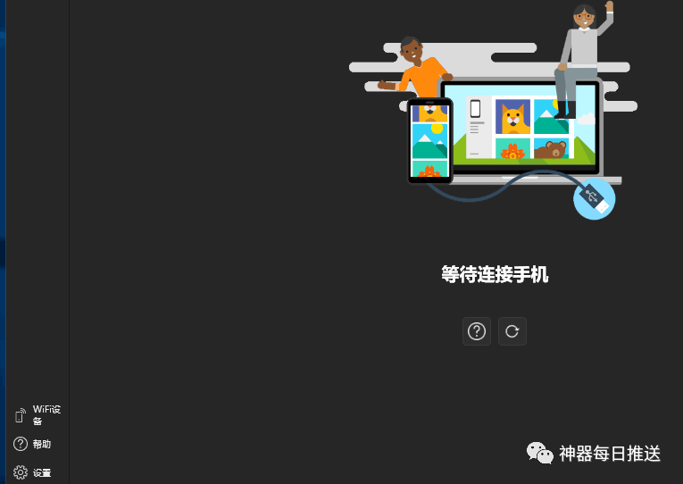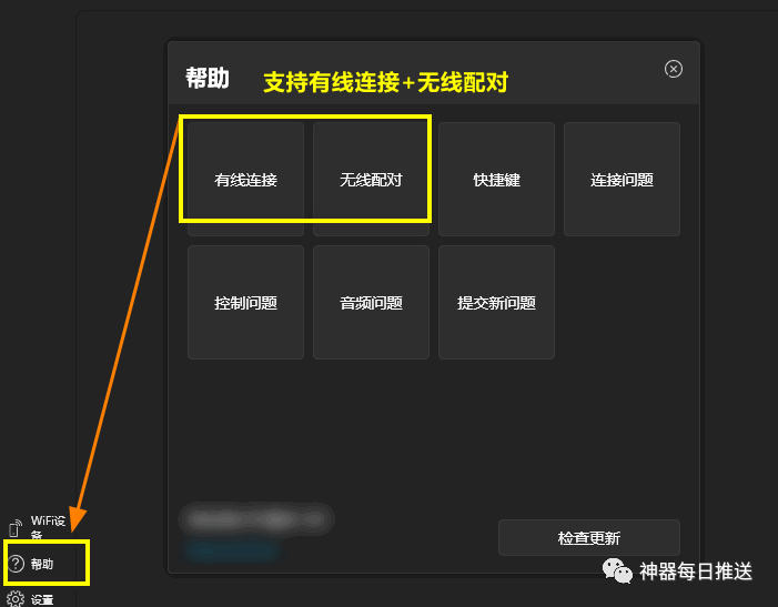 左侧菜单有个“帮助”,打开后有“USB有线连接”和“无线配对”连接入口,USB有线连接方式人人都会,这里不作演示,这里重点介绍“无线配对”连接方式。