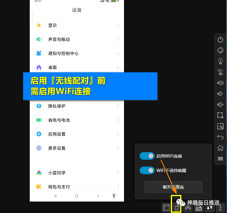 此外,启用「无线配对」连接方式时,还需要启用WiFi连接。如下图所示: