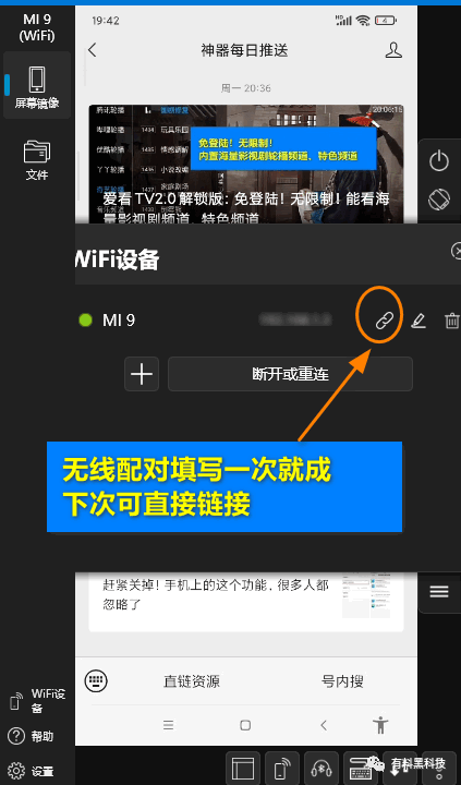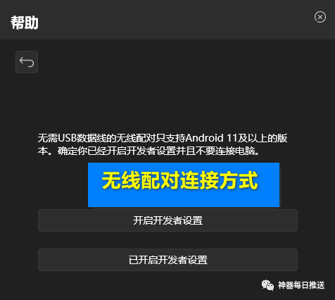 启用无线配对连接方式前,需要开启“开发设置”,然后启用手机“无线配对”连接模式;具体参照开发者的图文演示说明即可。