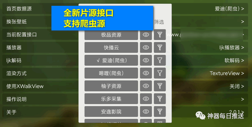 2、神器每日推送整理了多位大佬写的20余个爬虫片源接口,已检测并剔除了失效片源接口。
