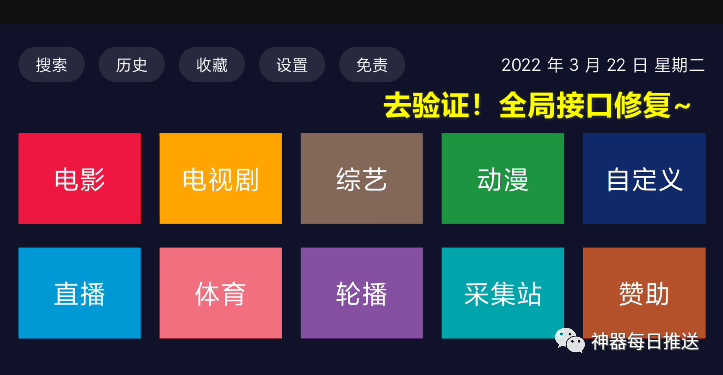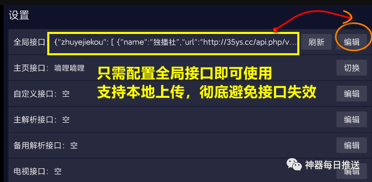 ——已去除验证解锁,已简化片源配置方式,只需要配置一个全局接口即可搞定。配置完成后,刷新一下才会显示数据。