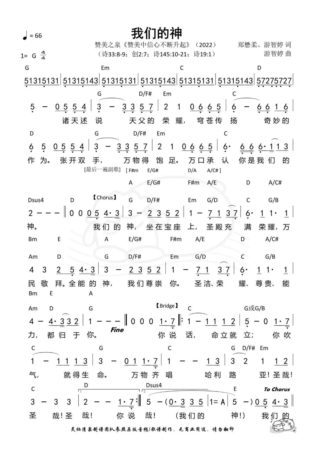 我们的神 You Are Our God 词:郑懋柔 Tiffany M. Cheng、游智婷 Sandy Yu 曲:游智婷 Sandy Yu © 2022 Stream of Praise Music / BMI. CCLI 7196186 中文: [Verse] 诸天述说天父的荣耀 穹苍传扬奇妙的作为 张开双手 万物得饱足 万口承认你是我们的神 [Chorus] 我们的神 坐在宝座上 圣殿充满荣耀 万民敬拜 全能的神 我们尊崇你 圣洁荣耀 尊贵 能力 都归于你 [Bridge] 你说话 命立就立 你吹气 就得生命 万物齐唱「哈利路亚」 圣哉圣哉圣哉