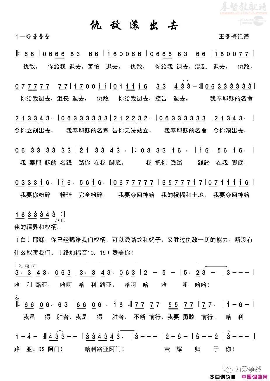 +- 首页 祝瑞莲 正文 音频播放地址: 视频播放地址: 词曲:卢静怡 仇敌你给我退去 害怕退去 仇敌你给我退去 混乱退去 仇敌你给我退去 沮丧退去 仇敌你给我退去 控告退去 我奉耶稣的名命令你立刻出去 我奉耶稣的名宣告你无法站立 我奉耶稣的名命令你滚出去 我奉耶稣的名践踏你在我脚底 *我把你践踏 践踏 在我脚底 我要你粉碎 粉碎 完全粉碎 我要夺回神给我的祝福和土地 我要夺回神给我的疆界和权柄 哈利路亚 哈利路亚 歌谱: 赞美诗歌未整理以斯拉盛晓玫祝瑞莲生命河灵粮堂小羊诗歌Jesus Image天韵合唱团新酒使命团我心旋律JLSS BlessedThe Hope佳音 赞美之门 收藏 分享 链接