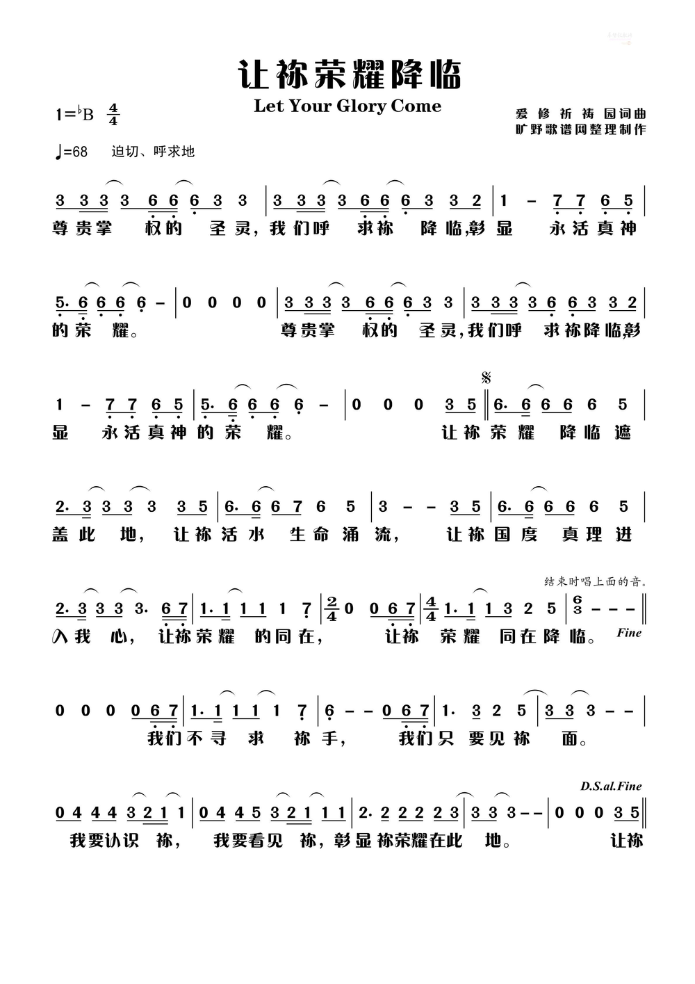 +- 首页 祝瑞莲 正文 音频播放地址: 视频播放地址: 让你荣耀降临 Let The Weight Of Your Glory Fall 曲: Steve Merkel 尊贵掌权的圣灵 我们呼求你降临彰显 永活真神的荣耀 尊贵掌权的圣灵 我们呼求你降临彰显 永活真神的荣耀 让你荣耀降临遮盖此地 让你活水生命涌流 让你国度真理进入我心 让你荣耀的同在 让你荣耀同在降临 我们不寻求你手 我们只要见你面 我要认识你 我要看见你 彰显你荣耀在此地 歌谱: 赞美诗歌未整理以斯拉盛晓玫祝瑞莲生命河灵粮堂小羊诗歌Jesus Image天韵合唱团新酒使命团我心旋律JLSS BlessedThe Hope佳音 收藏 分享 链接