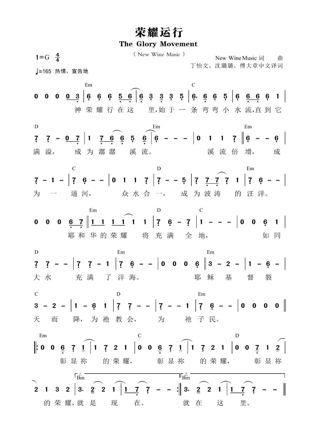 【荣耀运行 The Glory Movement】 神的荣耀行在这裡 The movement of God’s glory 始于一条 弯弯小水流 Starts as a small current of water 直到它满溢 成为潺潺溪流 Then it increases till it becomes a brook 溪流倍增 成为一道河 The brook will grow into a river 众水合一 成为波涛的汪洋 Become a sea and then a mighty ocean 耶和华的荣耀将充满全地 Then the glory of God will cover the earth 如同大水充满了洋海 Like the waters cover the ocean 耶稣基督 裂天而降 And Jesus will come 为他教会 为他子民 For His church For His church