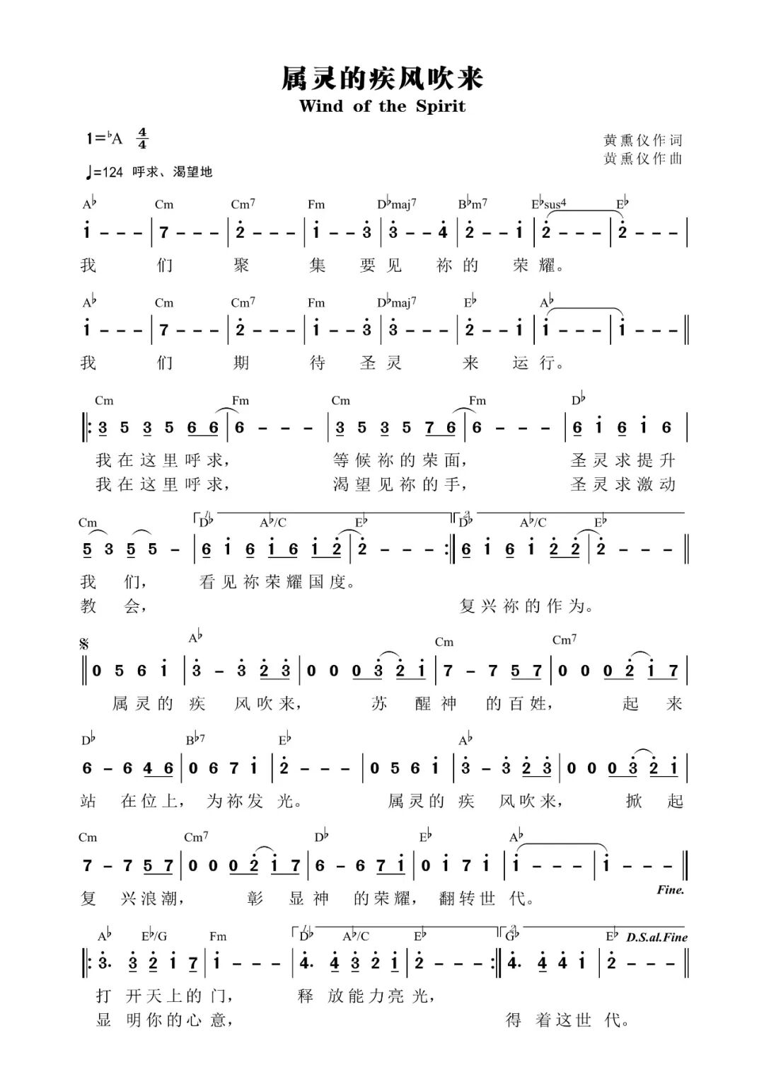+- 首页 FRCC幕主音乐 正文 音频播放地址: 视频播放地址: 词曲:黄熏仪 Jocelyn Huang 我们聚集要见你的荣耀 我们期待圣灵来运行 我在这里呼求 等候你的荣面 圣灵求提升我们 看见你荣耀国度 我在这里呼求 渴望见你的手 圣灵求激动教会 复兴你的作为 属灵的疾风吹来 苏醒神的百姓 起来站在位上 为你发光 属灵的疾风吹来 掀起复兴浪潮 彰显神的荣耀 翻转世代 打开天上的门 释放能力亮光 显明你的心意 得着这世代 歌谱: 黄友闻FRCC幕主音乐 收藏 分享 链接