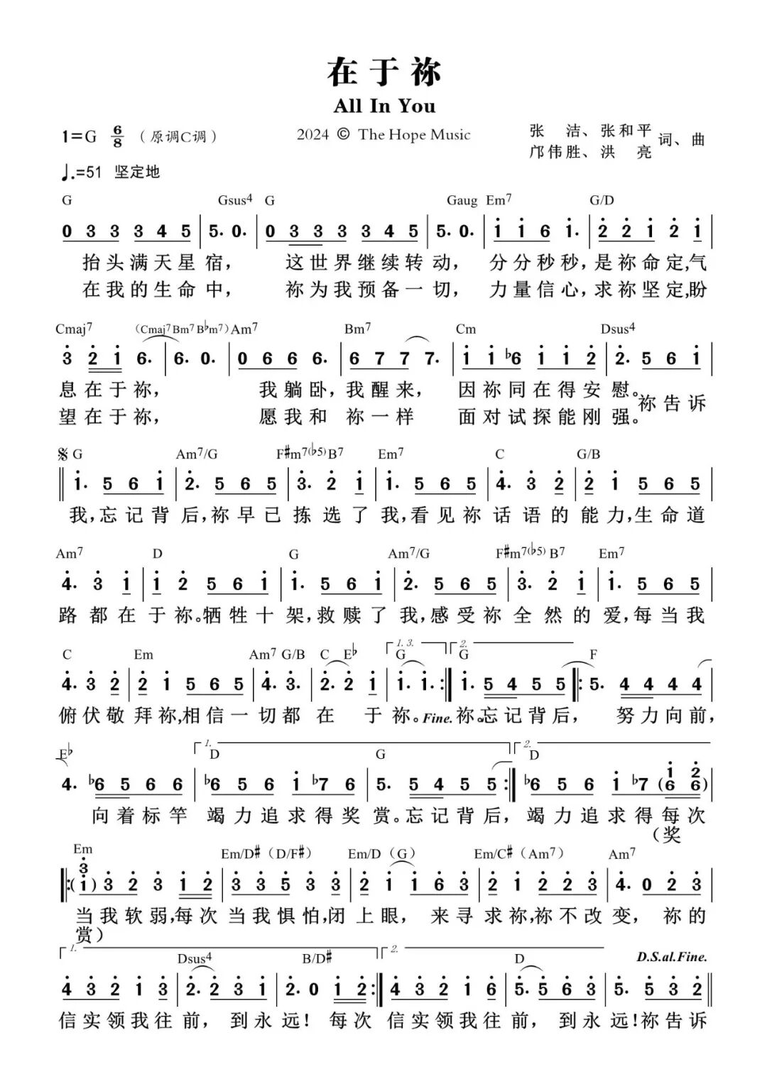 歌名:在于你(2024 EP) 词 / 曲:张洁 / 张和平 / 邝伟胜 / 洪亮 主领:张和平 ================================== (A1)抬头满天星宿, 这世界继续转动, 分分秒秒 是你命定, 气息 在于你, 我躺卧 我醒来, 因你同在得安慰, (A2)在我的生命中, 你为我预备一切, 力量信心,求你坚定, 盼望 在于你, 愿我和你一样, 面对试探能刚强, (B1)你告诉我 忘记背后, 你早已拣选了我, 看见你话语的能力, 生命道路都在于你, (B2-1)牺牲十架 救赎了我, 感受你全然的爱, 每当我俯伏敬拜你, 相信一切都在于你, (B2-2)牺牲十架 救赎了我, 感受你全然的爱, 每当我俯伏敬拜你, 相信一切都在 相信一切都在 相信一切都在 于你。 (Tag)忘记背后,努力向前, 向著标竿竭力追求得奖赏, (C)每次当我软弱,每次当我惧怕, 闭上眼 来寻求你,你不改变, 你的信实领我 往前 到永远,