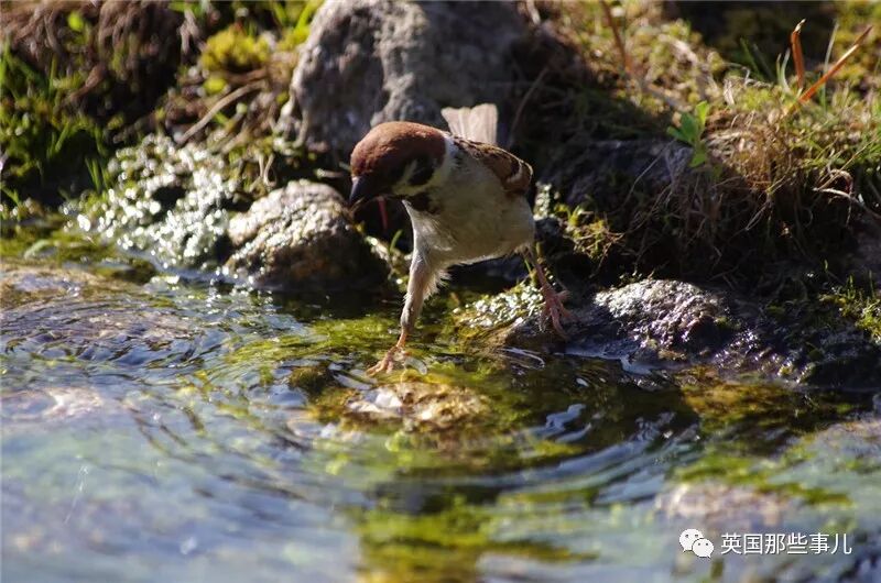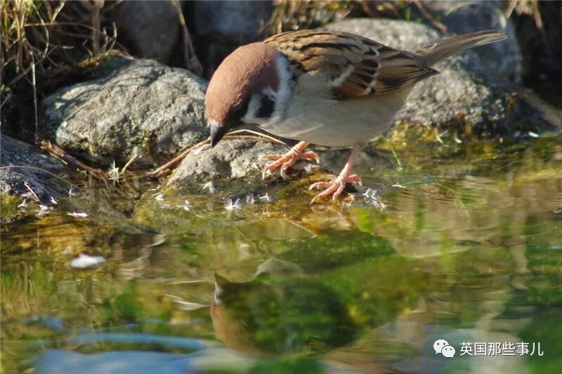 麻雀喜欢戏水,先伸伸腿,小心翼翼地试下水温。