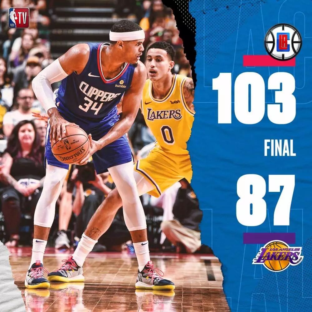 末节哈勒尔担当奇兵连续强势拿下4分,路威则依旧不讲理外线再飙三分,快船开局不久再度取得两位数的领先优势。祖巴茨凭借个人能力点抢进攻篮板补篮得手,但这是湖人长达4分钟里唯一的进球。史蒂芬森关键时刻打成2+1为湖人破荒,但湖人整体手感依旧不佳,湖人整场比赛仅命中3记三分,这一节三分线外更是颗粒无收。快船这边随着罗宾逊的三分再中,球队的优势来到了16分早早奠定胜局。最终,快船103-87轻取湖人拿下季前赛德比战的胜利。